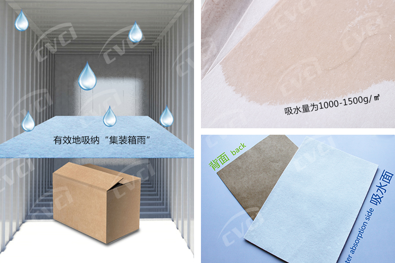 1.箱運輸時,將復(fù)合吸水紙放置集裝箱頂部及貨物關(guān)鍵部位,吸水面朝外;